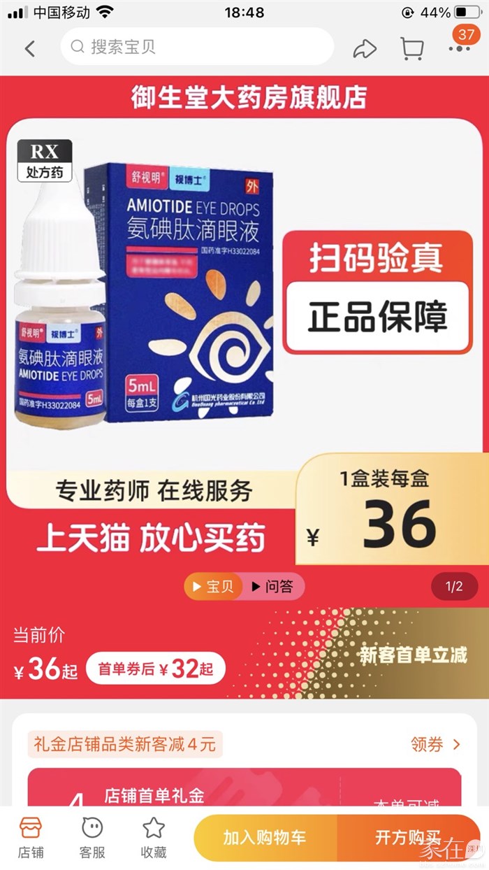 低价转正牌“舒视明”牌、氨碘肽滴眼液、 5ml*1支/盒。因本人患飞蚊症(玻璃体混浊),多次购买舒视