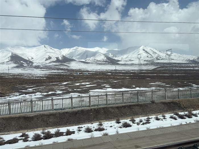西宁向北,正式离开黄土高原,进入祁连山区。祁连山脉东西很长,但是并不是很高。如果兰州到西宁的沿路你觉得人烟罕至的话,这里已经是没有人类生活的痕迹了。山区并不陡峭,积雪下有一些贴地的植物,像草又不像草。这些都不重要,重要的是它是野生牛羊的食物。时不时就能看见满山遍野的牛羊在吃草。数量之多,使我不得不怀疑这就是野生的,因为没有那么多人有精力来伺候它们的吃喝了!