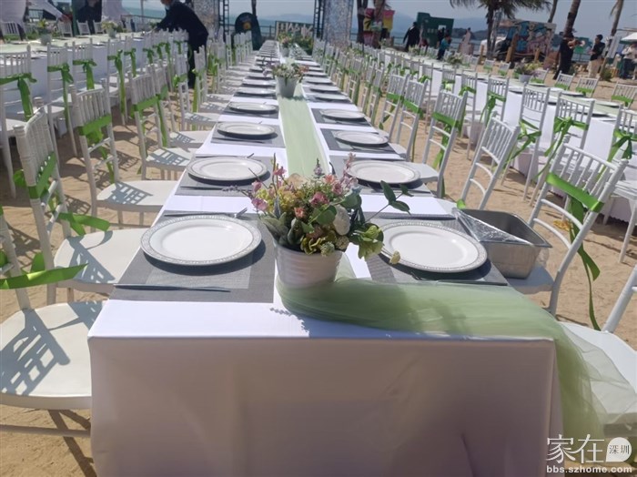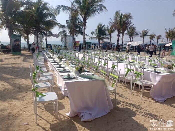 首先,小伙伴们早上7:00到我们公司,装车,自助餐用的碟子、刀、叉、筷子、电热板、小花锅、长条桌、桌布、口布、餐垫、餐夹、一次性手套等等,有些东西看起来平平无奇,没什么用,但是要用的时候却很重要的。装好车之后是去现场,我们是从深圳出发到惠州巽寮湾沙滩,那里的太阳有点大,不过景色真的很美,我们先找地方卸货,然后先把就餐桌摆好,我们差不多摆好的时候,另外一拨摆椅子的也在用最快的速度去摆好椅子,还进行了装饰,漂亮的竹节椅绑上彩带真的好美。在这个经过精心布置的就餐区吃饭享受着美丽的海景听着喜欢的歌星~~~真的好享受