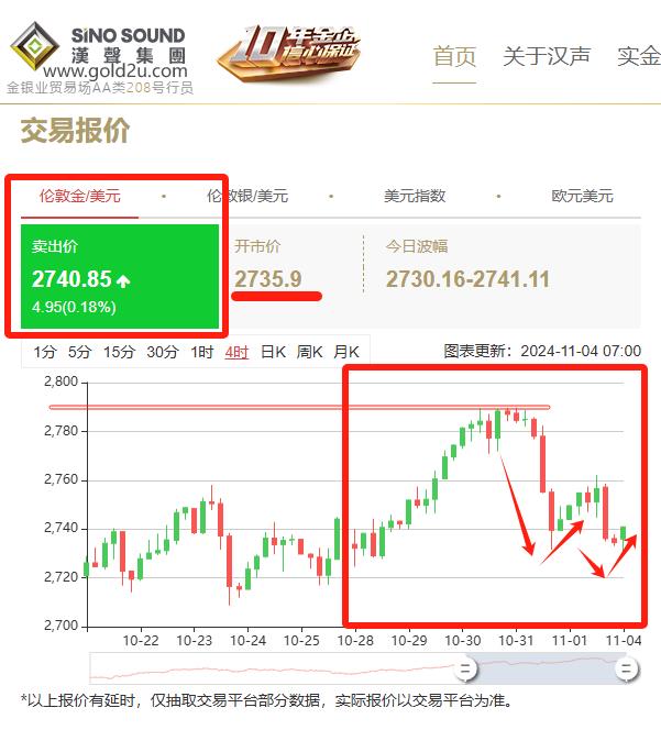而本周周一(11月4日)国际黄金亚市早盘开盘小幅高开至2735.90美元/盎司,短暂走强后迅速回落,但由于力度有限,并维持震荡波动偏回升。汉声集团分析师表示日内将重点关注美国9月工厂订单月率,预期将利好金价,故此,根据日内的回落力度,仍可看一定的反弹空间。所以,后市操作偏向低多看反弹为主。本周市场将迎来美国总统大选的结果,以及周五凌晨的美联储利率决议,预计在结果出炉之前,相关的不确定性将继续对金价构成支撑