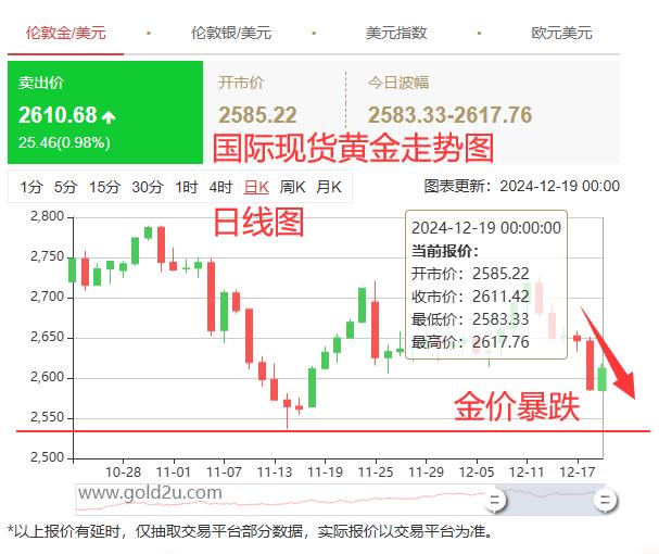 凌晨美联储如期降息25基点,但同时也降低了2025年降息的强度和幅度,由四次变为两次, 所以,市场理解为美国通胀还是比较缓和,造成了黄金利空大跌,日线图看到最低降到了2583美元/盎司一线。