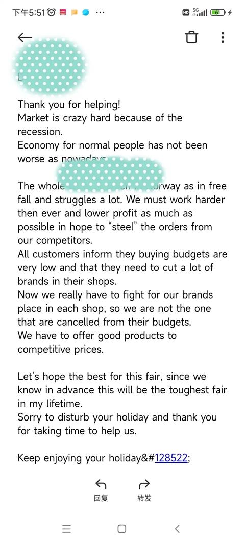 引用superble的发言:这个客户来自挪威吧,将steal笔误成steel了。你们做的是厨具产品吗?fair是指今年上半年的广交会吗?这种交易会有效果吗?引用23楼楼主的发言:世界经济衰退期,生意尤其艰难,在我们放假期间客户都在砍价欧洲战场感觉也是随时能点着。我也不想东想西了,收拾心情,好好准备上班,房网朋友们一起加油吧。