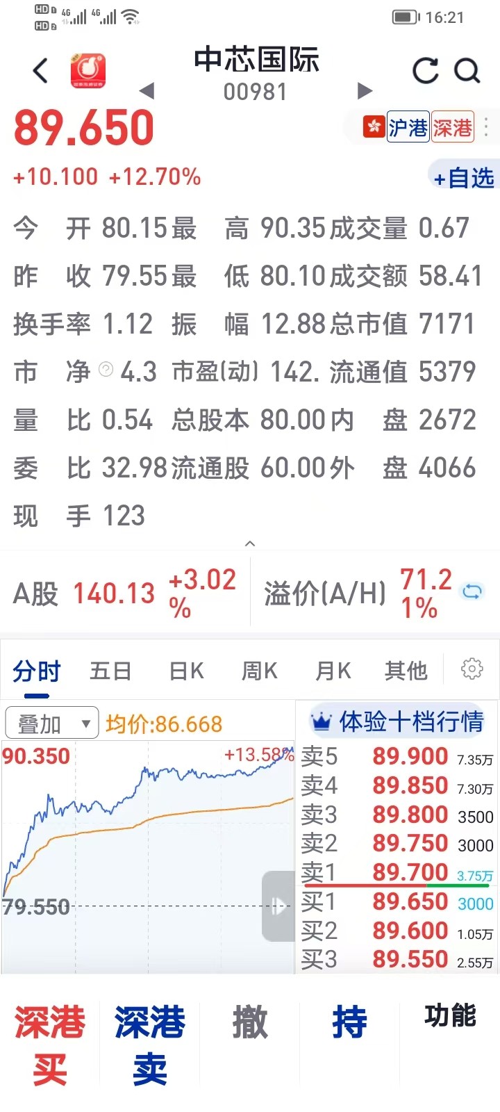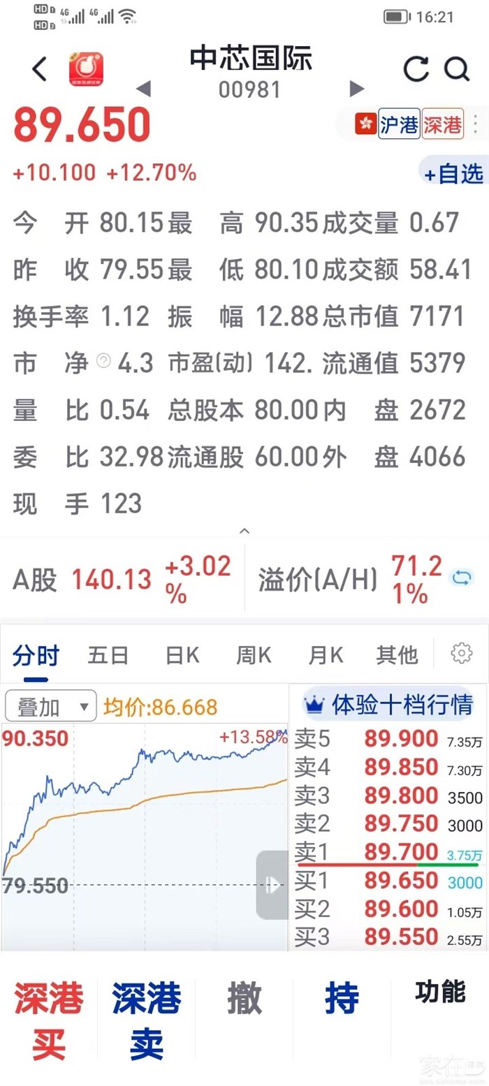 中芯国际,最高涨13.58%