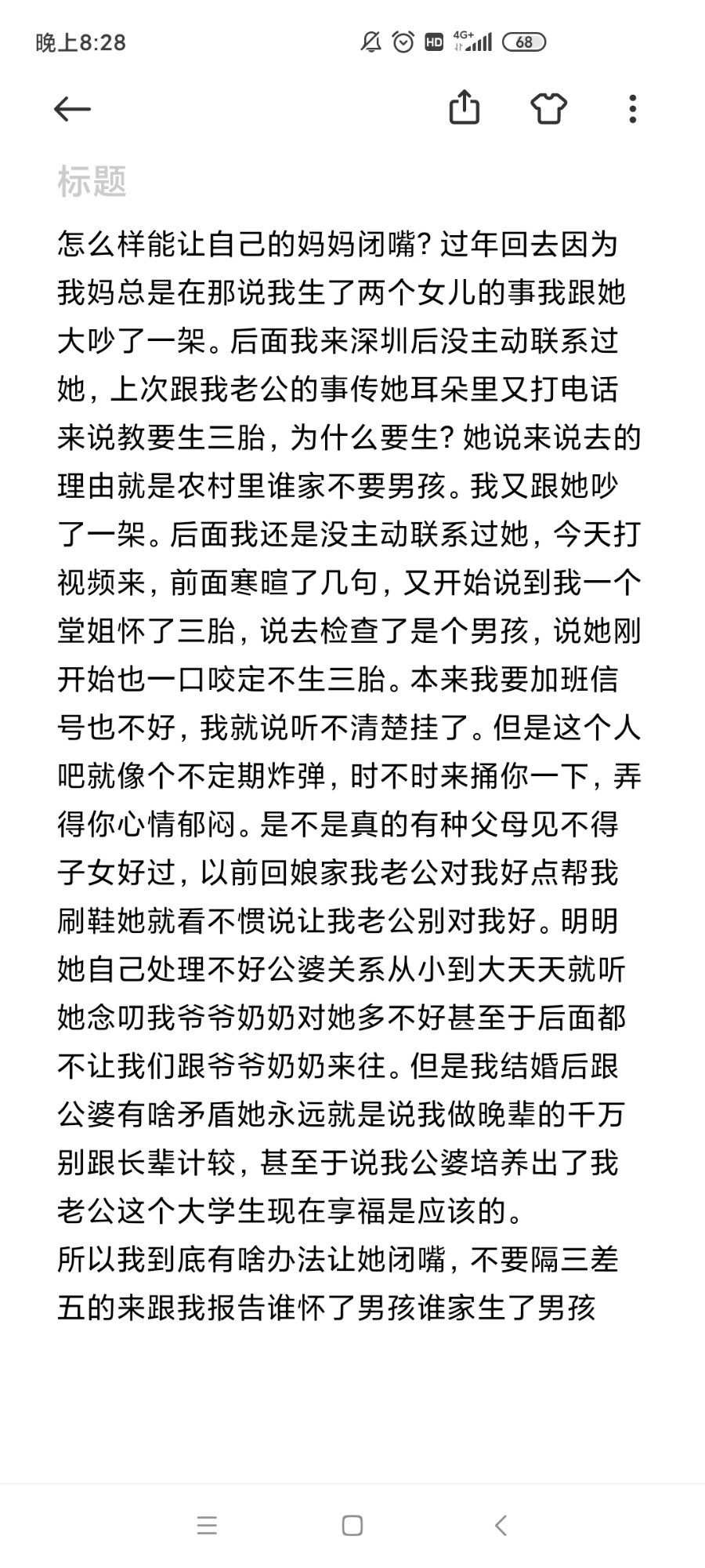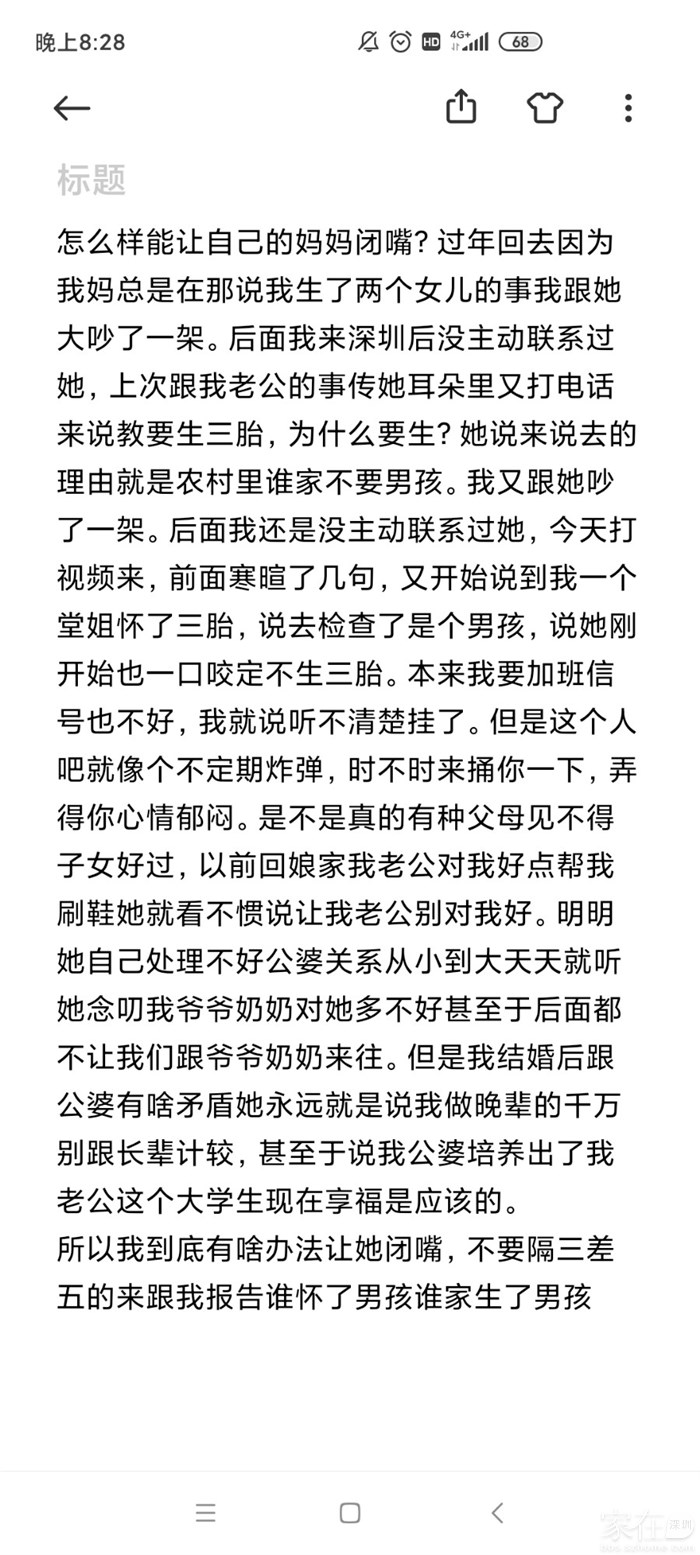 4.处理不好家庭跟原生家庭关系。娃五个月的时候他爸妈来深圳带娃,他妹也跟着一起来了。小姑子是和很会来事的人,比如我刚结婚的时候她会说我洗衣机哪里用的不对,我卫生间洗发水不应该放窗台会被阳光照到。我老公说他们家以前很穷一家四口挤睡一张床直到初中他才一个人去睡的柴房。后面他工作两三年家里建了新房子,他靠着几千块钱的工资加出差补贴攒了十万拿回去。他说家里的大部分东西都是妹妹买的所以就有了前面我说的楼上有间房是他妹妹的让我别惦记。他们一家的关系真是很亲密相互维护。其实最先我是很羡慕他家和谐的关系,因为我自己原生家庭感觉跟父母有隔阂,但是最后发现和谐的是他们,那是我攻不进去的堡垒啊。他父母和妹刚来深圳他还提议找个三房一起住,有次一起去超市他妹跟他手挽手我只有尴尬的走旁边。后面我跟他说这事,他说他妹脸皮厚他有什么办法。再然后大家在磨合中带娃也发生了几次比较凶的摩擦,一次是因为他爸在家吸烟,我当时在洗衣服让他把娃抱房间去关上门。他不干,我就把衣服往桶里一扔说你来洗吧,我就抱着娃去房间了,结果我还没反应过来他爸一脚踢开了我房门,我关上他又踢开,当时把我吓懵了。后面偶尔的几天我早上发现我的洗脸盆上放着一个烟头。