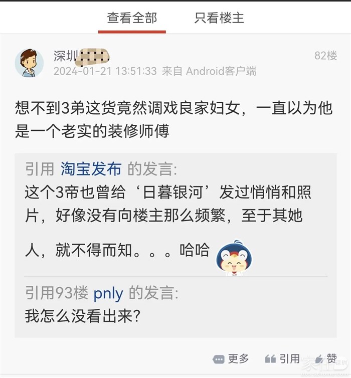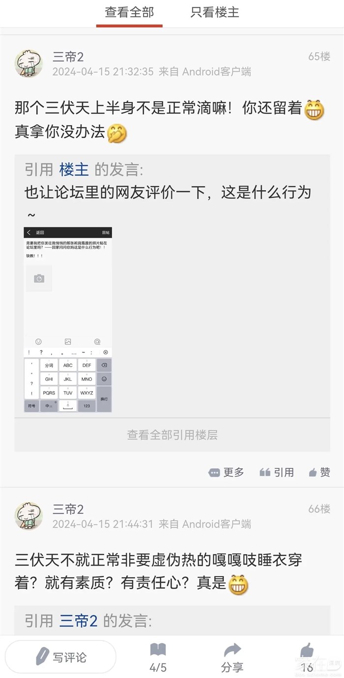 引用楼主的发言:我不是怕事的人,也不怕事,这垃圾发悄悄骚扰我朋友,明面上是君子,暗地里一坏B,所以我帮她出气,同时让大伙看清伪君子的真面目引用难启的用户名字的发言:三帝除了非常自恋一点吹吹牛。被大家调侃开开玩笑,当然,他也有点开不起玩笑会说脏话,哈哈一笑就过去了,怎么也算房网网红了,应该不至于道德水准这么底下,明目张胆的干坏事,智商也不允许啊。兔子还不吃窝边草呢?他再笨也应该比兔子聪明啊。如果说咕咕唧欺负他,这个绝对相信。个人看法。