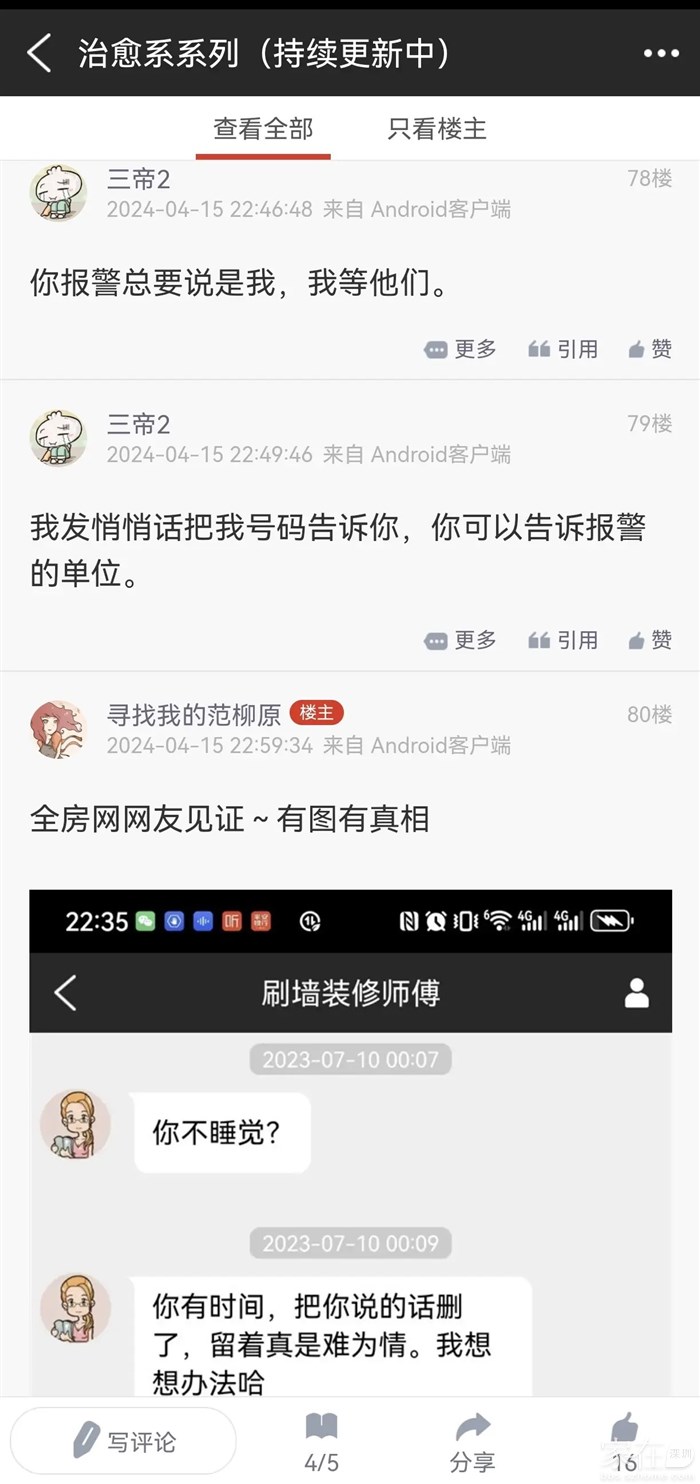 今天有时间,那我就回应下你。1关于骚扰,我没时间上房网更没时间评论,所以偶尔点了两个赞。当然你也提醒过,也没少让你骂,但我只看内容没注意是你。2除了偶尔点下赞之外,我也没跟你发个悄悄话说过什么,之所以你保留那些悄悄话都是因为我点赞骂我,我知道自己不对,自己给我自己一点面子。我不知道除此之外骚扰过你什么或者说做过什么说过什么?引用寻找我的范柳原的发言: