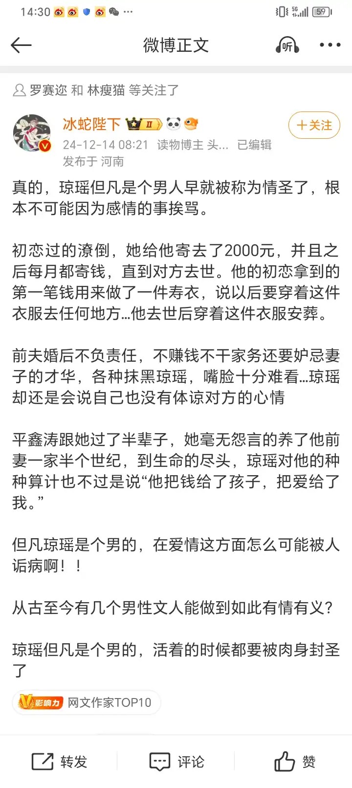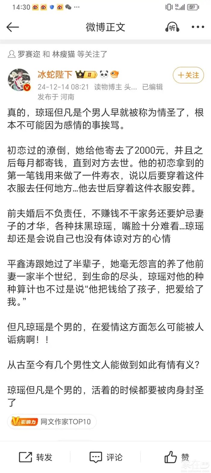 没有琼瑶他们的婚姻也未必牢固。这件事里面最渣的是男人,却没有人骂他。女人就是比男人要难。琼瑶当三固然不对)貌似都在说台湾那个时候一夫多妻制还合法?)但是原配和子女在享受了琼瑶带来的种种好处以后,在双方再婚了几十年之后,女方尽心尽力照顾他们的老父亲,再来开撕,怎么都不是厚道之人。可能是为了利益吧。要不然以前怎么能和上伤害自己母亲的女人和和气气共事几十年?平鑫涛去世的时候,琼瑶的儿子儿媳妇和孙子一一过来道别,场面温馨。反之呢?人品修养,高下立见。
