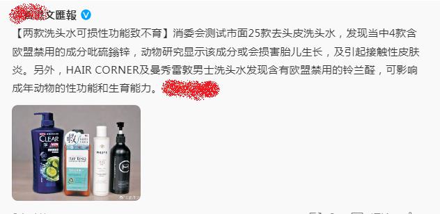 另外,HAIR CORNER及曼秀雷敦男士洗头水发现含有欧盟禁用的铃兰醛,可影响成年动物的性功能和生育能力。