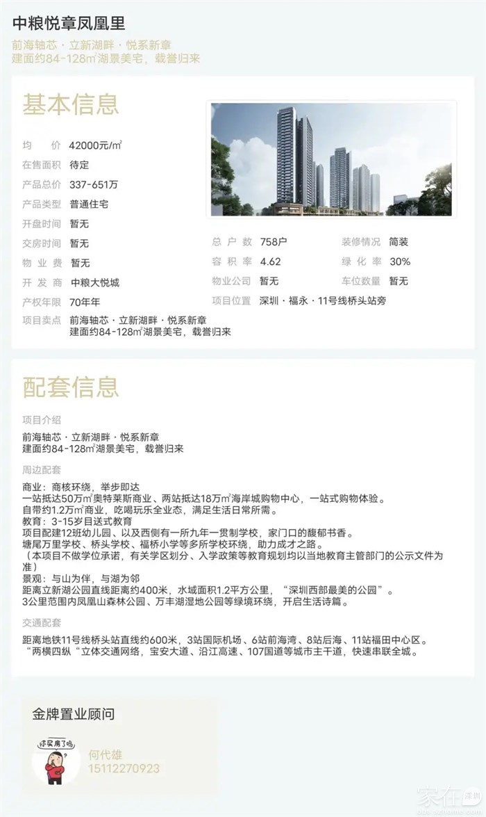 来看一个曾经被住建局重点关照过的网红牌,当时把上头给惹毛了,直接呢停了他一期二手房的网签,不过注意关键词哈,是二手房网签,也就是说呢,跟开发商本身没关系的,而是它的业主们呢,对楼盘的价值自信到爆棚,要这样又要那样才导致的。那这盘的价值到底怎么样呢?一起来看看他新的一期中粮乐章凤凰岭先说基础信息哈,楼盘一共有七栋,三栋共有产权四栋商品房总户数1426户,可售商品房758户,都是三梯六户,总高33到34层,得房率也就还不错,78%,算飘窗的话,使用率有85%-90%,计划于二五年中简装交楼,车位也还可以,把共有产权房一起算账,都接近1 : 1.1,自带1.2万方社区商业12班幼儿园隔壁就规划有一所1600。500个学位的九年制立新湖学校,具体品牌和建成时间呢未知,不过大概率会在二五年交房的时候建成,曾经的老业主那么自信,那我们就先说优点哈,第一个交通好,600米呢,就11号线桥头站五站宝中六站前海湾两公里以上107算是宝安中北部当前在售的盘里面大交通比较好的了。第二一个有大饼楼盘呢,位于规划的立新湖科创总部内,整个园区规划的范围是这样的,面积呢有五平方公里,从法定图则可看出区域内的住宅用地比较少,除了这里,另一块呢,就是宏荣源珈誉府的那个南侧地块了,其余的住宅用地呢,都已经建成了,意味着未来如果想在这个园区内置业,是没有新房可选的了,还是有一定的稀缺性,第三产品好,开发商呢,还算比较有前瞻意识,把面积做小了,总价就给降下来了,84平方可以做个三房两卫,空间肯定不能算阔绰,但至少功能啊,它是满足的,吹风起步价4.3万,真这样的话,三百六七十万就能上车,98呢就能做个正常空间的三房,还这么大个阳台,114呢就能做横厅大阳台四房,就看真实的价格如何了哈,如果他就要奔着跟嘉裕府去卷的话,不能说都好吧,至少还是有一定竞争力的,值得参考参考再做决策。另外呢,如果有喜欢湖岸公园的老爷,这里也还算不错,湖百米就能到达湖边的栈道。但是哈,至于。开发商所说的什么湖景啊这些就算了,楼盘跟湖之间还隔了有厂房,谁知道未来的旧改会改的多高,会不会把湖景挡住了,是不是?再说缺点哈,第一,当前周围环境比较难看,都是老旧厂房,居家氛围不足,说人话呢,就是你感受不到这个是个生活的地方,它更像是打螺丝的地方。第二,立新湖的饼也好也不好,不好的呢,就是他不就改了,那就难看,他要就改了,那未来相当长的时间呢,你可能都要忍受施工的影响。第三一个周围没什么像样的大商业,自带的1.2万方呢,也仅能满足基本需要,未来了只能依托1.5公里外的奥特莱斯,当然了,这也好也不好啊,喜欢商业的呢,就觉得它的距离比较尴尬,不喜欢商业的呢,就觉得保持一点距离,清近还不拥堵,如果你在南山。山西宝中等11号线沿线或者就在当地工作,日常呢也是地铁出行居多,相对商业和所谓的居家范围不是特别敏感的话,预算又400万左右,那么这里值得看一看,但如果你在南山东或者福田呢,可能可对比选择的就比较多了,这呢就未必一定是适合的了哈。另外全网仅有的全景VR估计也只有我们才有了,有需要的粉丝老爷艾特我,。总结呢,就是综合各方都还行,没有特别大毛病,诚意如何看价格,价不到位咱就停。