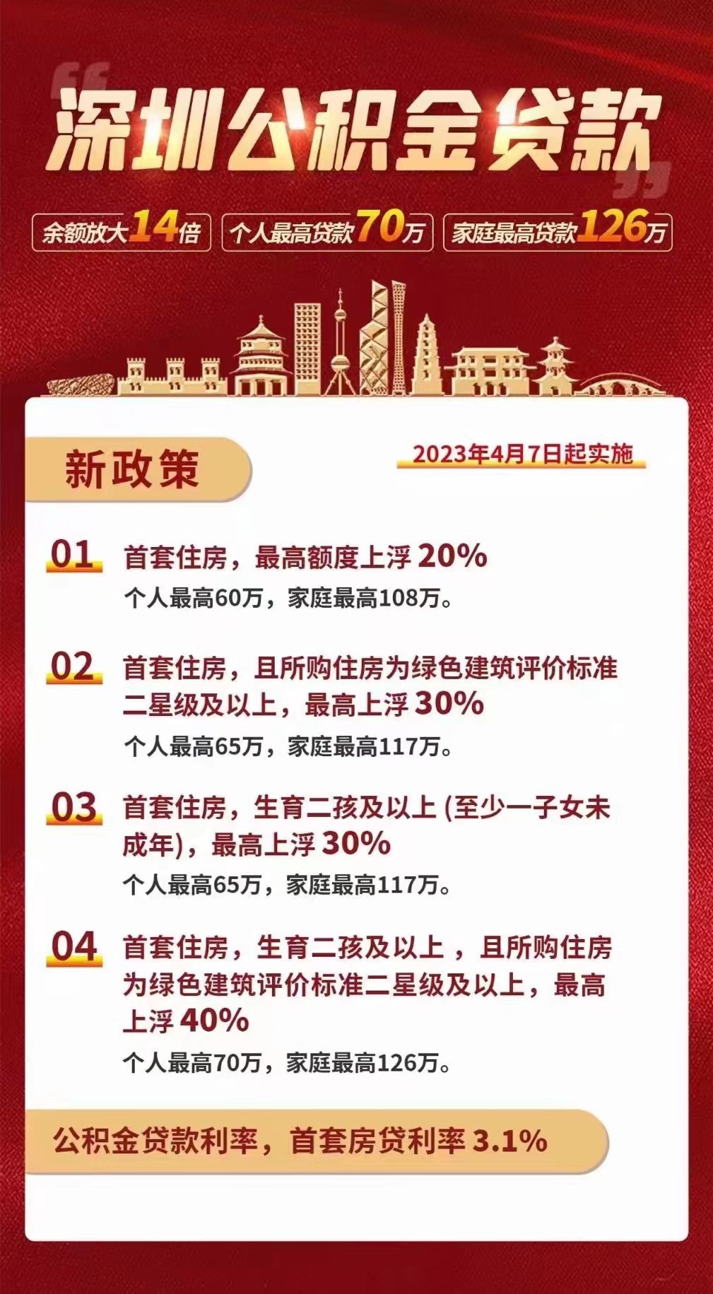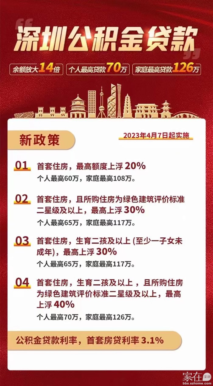 引用楼主的发言:深圳:生育二孩及以上的多子女家庭使用公积金贷款购买首套住房 贷款最高额度可以上浮30%】财联社3月24日电,深圳市住房公积金管理委员会印发《深圳市住房公积金贷款管理规定》 ,其中明确公积金贷款可贷额度不高于单套住房的公积金贷款最高额度。单独申请的公积金贷款最高额度为50万元,申请人和计算可贷额度的共同申请人共同申请的公积金贷款最高额度为90万元。符合下列情形之一的,公积金贷款最高额度可以上浮一定比例:(一)使用公积金贷款购买首套住房的,其公积金贷款最高额度可以上浮20%;(二)使用公积金贷款购买首套住房,且所购住房为绿色建筑评价标准二星级及以上的绿色建筑的,其公积金贷款最高额度可以上浮30%;(三)生育二孩及以上的多子女家庭(至少一个子女未成年)使用公积金贷款购买首套住房的,其公积金贷款最高额度可以上浮30%;(四)生育二孩及以上的多子女家庭使用公积金贷款购买首套住房,且所购住房为绿色建筑评价标准二星级及以上的绿色建筑的,其公积金贷款最高额度可以上浮40%。
