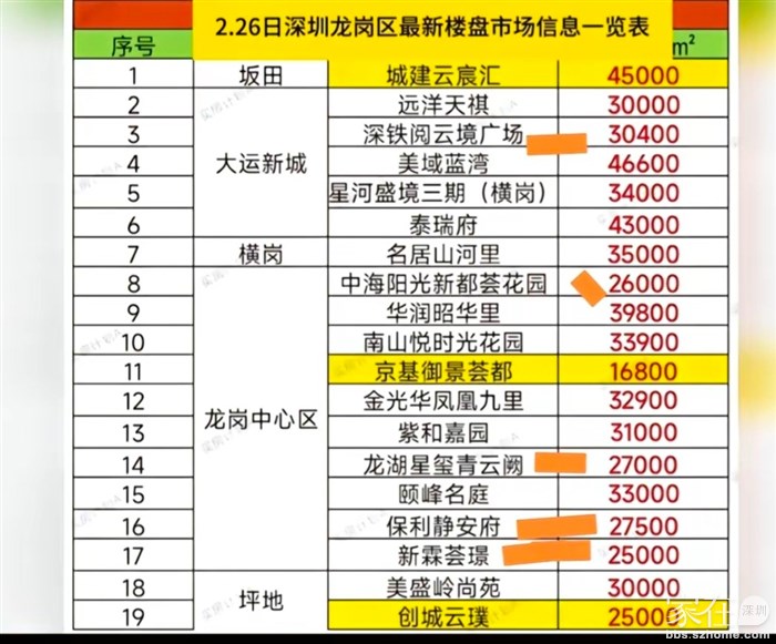 更不要说坪山了 早段时间4万降到2.3万小作文。没有跌价的时候 横岗星河盛镜毛坯去到5万每平 龙岗中心区高峰期还去到7-8万。