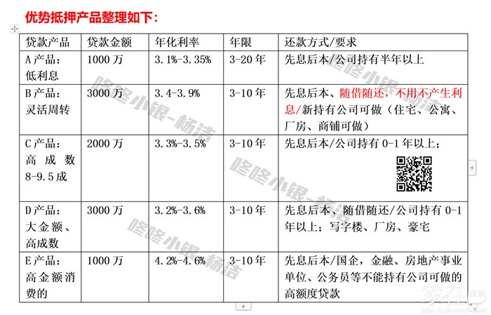 咚咚小银-杨洁整理近期优势抵押贷款方案,推荐给大家参考:如果你有贷款需求,无奈市场上产品信息太多,五花八门,眼花缭乱,每种方案都有针对适用的人群,你都可以联系咚咚小银-杨洁,线上一对一专属服务,理清贷款思路,计算贷款成本,并定制专属个人的贷款方案。详情咨询咚咚小银-杨洁18908768580
