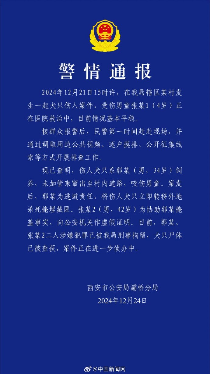 24日,西安市公安局灞桥分局发布通报称,伤人犬只系郭某(男,34岁)饲养,未加管束窜出至村内道路,咬伤男童。案发后,郭某为逃避责任,将伤人犬只立即转移外地杀死掩埋藏匿。张某2(男,42岁)为协助郭某掩盖事实,向公安机关作虚假证明。目前,郭某、张某2二人涉嫌犯罪已被刑事拘留,犬只尸体已被查获,案件正在进一步侦办中。