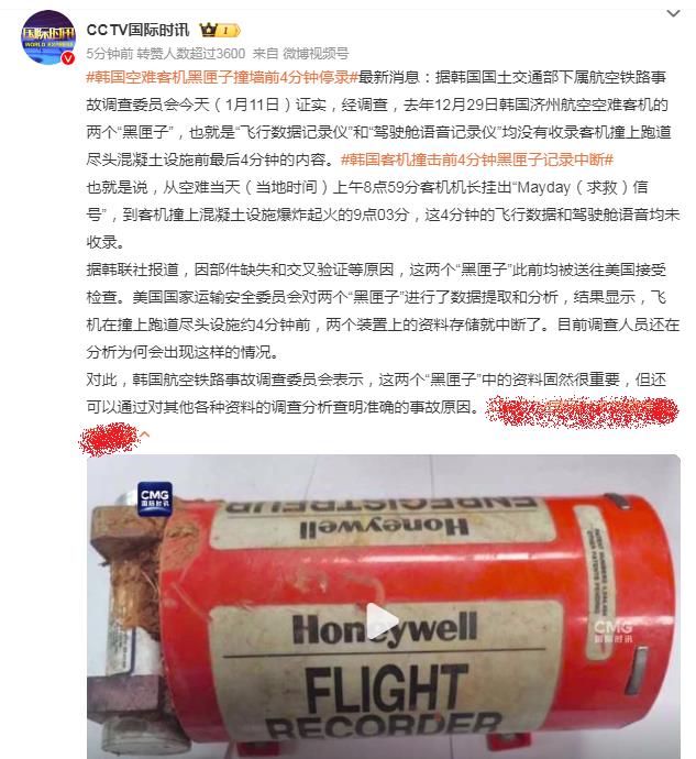 韩国空难客机黑匣子撞墙前4分钟停录。