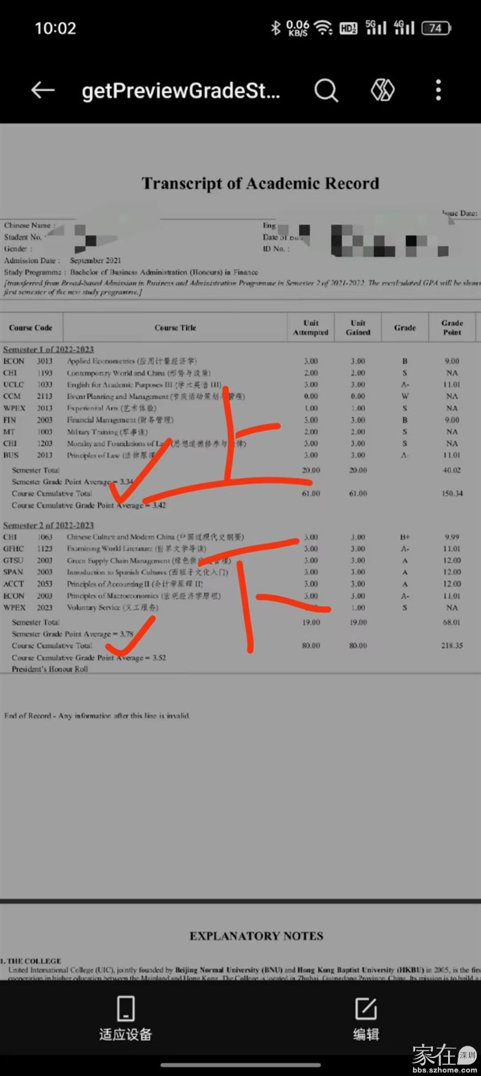 引用157楼楼主的发言:现在陆陆续续有一些考试,然后期末有集中考试。成绩单是学生自己查,我在家长群里看到了别人分享的期末成绩单长什么样子。平均绩点很重要,决定了能申请到什么层次的海外院校研究生。如果学生平均绩点低于2,学校会发信息给家长提醒注意。 这个平均绩点(GPA)成绩会考虑平时的考试成绩,具体算法我懒得去弄懂了。女儿的成绩,我打算佛系了,底线很低,能毕业就行。我当年读大学是本专业尖子生,付出的时间精力非常非常多,牺牲了很多乐趣,很累。我也看到Uic公众号里一些学霸学长们分享的学习、申研方面的文章,需要本科期间的持续时间投入和规划能力。我女儿不是那种能主动全身心投入卷学习的,除非发生了什么外部影响因素推动她,否则估计是差不多就行。引用156楼未明的发言:看来没有期中考试?引用155楼楼主的发言:下周开始女儿要放一周的阅读假。昨天女儿告诉我她这周六晚上到家,因为周五晚上要考试,周六上午又安排了小组讨论,学业繁忙之余还坚持隔三差五去健身房锻炼。现在的年轻人都很注重养生,有一回她说刚跑了半小时就不得不让出跑步机给排队的同学。阅读假,想干啥都行,可以卷学习,准备商赛,健身,游玩。女儿选择了游玩,计划好了去北京找她在北京上大学的闺蜜玩。四天三晚的特种兵旅游吧算是,机票来回1360,三晚住宿1100,行程安排基本上是逛吃,有一天是去闺蜜大学校园游玩。