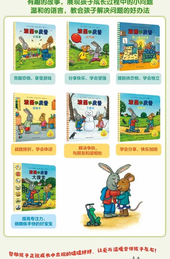 “小小聪明豆绘本系列波西和皮普”系列是德国著名儿童文学作家及插画大师阿克赛尔·舍夫勒的代表作,细腻活泼的画风、轻松灵动的语言将孩子成长路上的小烦恼、小脾气、小别扭描绘得可爱至极,父母在陪伴孩子阅读故事的时候也会忍俊不禁,也会同孩子一起经历着一个个成长路上的甜蜜小烦恼。