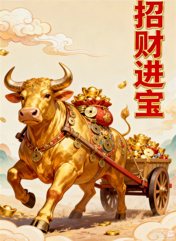 丑牛为艮,艮为巨门,为财库。一匹健壮的金牛,踏着雪白的云彩,拉着一斗的金子,从东北方跑步而来,象征着生发的气象,财源滚滚。