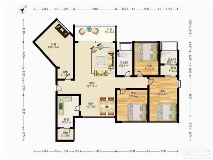 户型:4房 2厅 2卫 2阳台