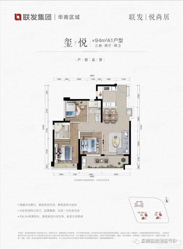 约94㎡三房两厅两卫,冰箱隐藏式特色设计,物品收纳轻松高效;U型厨房洗切煮动线合理,提高烹饪效率;三分离公卫,功能分区安全易清洁