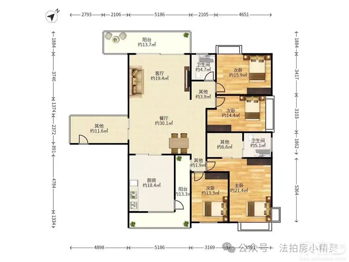 面积:136.35㎡  4房2卫