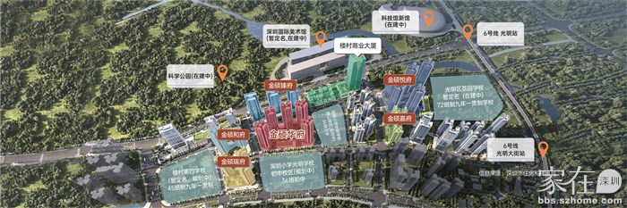 2.金硕华府南面是幼儿园、深圳小学光明学校中心校区,东面是深圳小学光明学校狮山校区,而且金硕华府户型都是朝南、东南、西南方向,且学校的楼层都比较矮,金硕华府视野都比较开阔,短距离内没有高层建筑遮挡;金硕和府仅西面是深圳外国语成员学校,西南朝向视野稍好