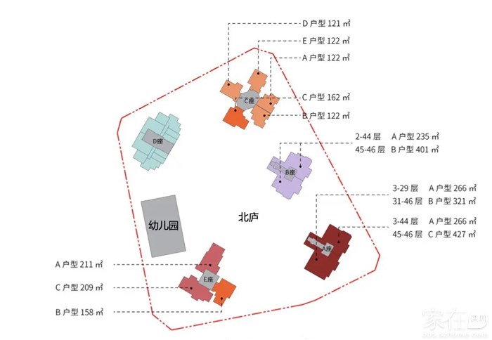 北庐住宅户型:建面约210㎡、235㎡、266㎡、321㎡,410-470㎡(复式)