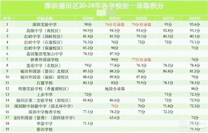 福田区初一各学校录取积分,2024年最新。2020-2024