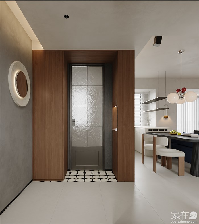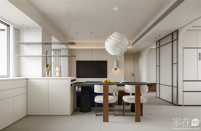 🍽 餐厅: 餐厅区域与客厅无缝连接,我们使用了圆形的吊灯和简洁的餐桌,既实用又美观。木质的墙面和橱柜不仅增加了储物空间,也为整个区域增添了一丝温暖。