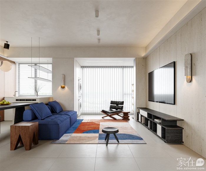 🌿 色彩搭配: 整个空间的色彩搭配以中性色为主,通过蓝色、灰色和木质色的巧妙结合,营造出一种和谐而舒适的视觉效果。彩色的地毯和装饰品则为整个空间增添了一抹亮色,使空间更加生动和有趣。