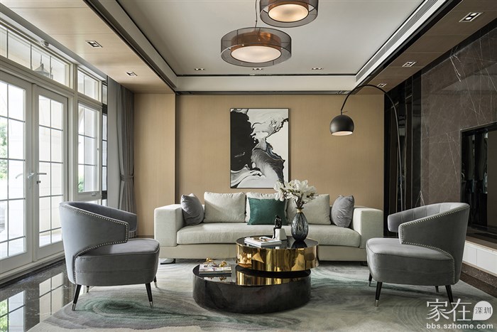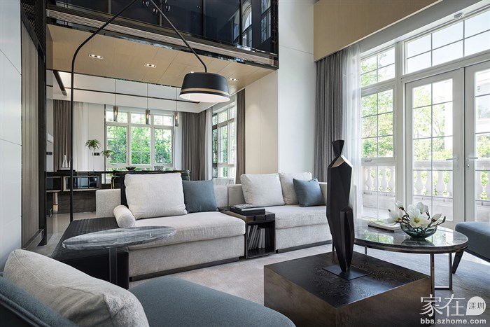 客厅是上下两层设计,超挑高的屋顶,配上明亮大大方方的落地窗,尽显大气和贴近自然。