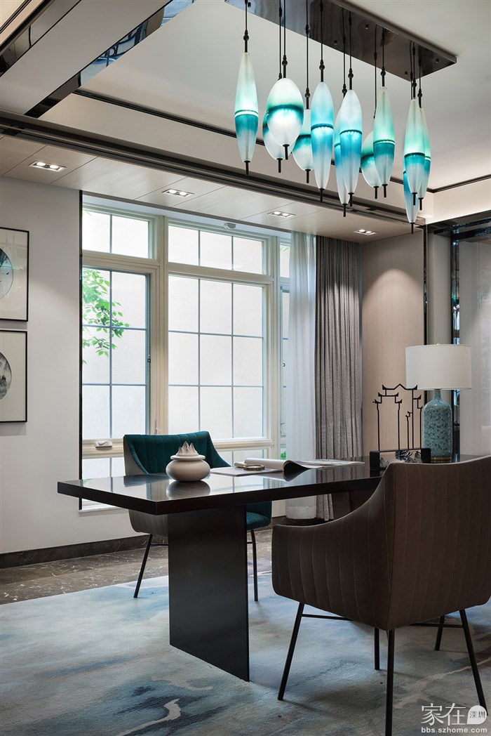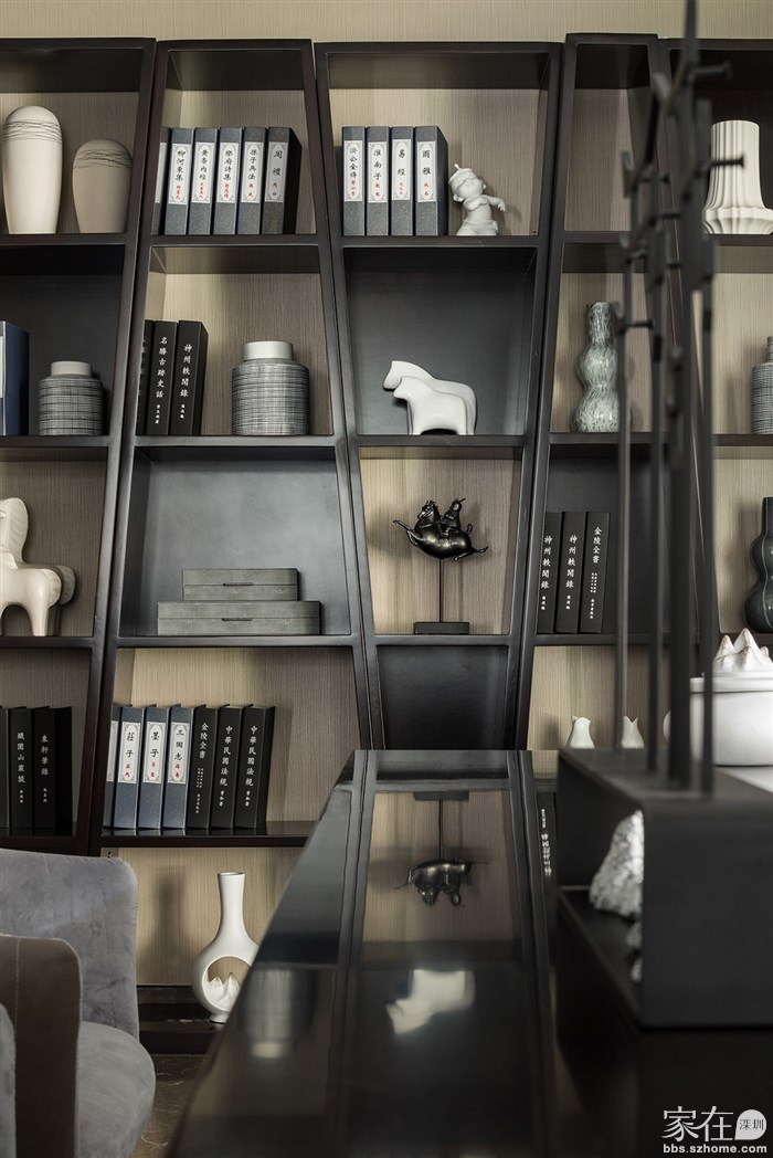 家具陈列大气又不厚重,可爱的意式简约书椅,桌面上中式小茶壶的点缀,中西文化巧妙的结合运用,展架上各种素雅清新的瓷器摆件,可见业主是一个十分热爱生活懂生活的人。