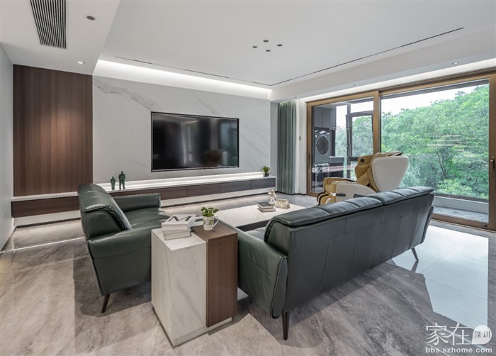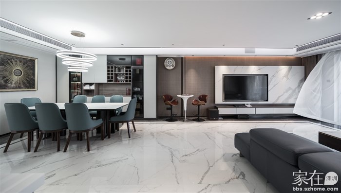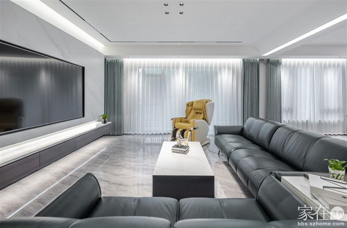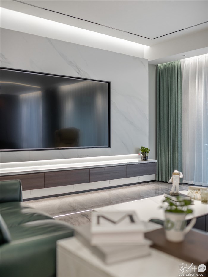 ④一定要在底板上再开一个槽,嵌入灯带,这才是悬空电视柜的完全体。但要注意,如果地面是亮光砖,要用倾斜角度的灯带打墙,不要直接照射在地面上,哑光砖跟柔光砖请随意。