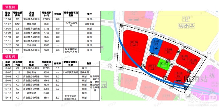 根据已批准的[宝安中心区]法定图则,12-06地块规划用地面积22725平方米,容积率6.0,配套设施项目“-”,备注“规划”;12-07地块为供电用地(U12),规划用地面积4593平方米,配套设施项目“110千伏变电站”,备注“现状保留”;12-08地块规划用地面积7756平方米,容积率8.0,配套设施项目“-”,备注“规划”;12-09地块规划用地面积4768平方米,容积率8.0,配套设施项目“-”,备注“规划”;12-10地块规划用地面积4539平方米,容积率8.0,配套设施项目“-”,备注“规划”;12-11地块规划用地面积8050平方米,容积率8.0,配套设施项目“-”,备注“规划”;12-12地块为公共绿地(G1),规划用地面积2933平方米,备注“规划”;12-13地块规划用地面积8881平方米,容积率8.0,配套设施项目“公交首末站3000平方米”,备注“规划”。