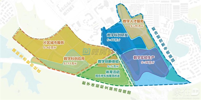 复合型创新中枢组团:以枢纽为动力源,以数字科创产业研发为核心,配套人才公寓、梅林关博物馆、绿脉休闲活动空间等复合功能。
