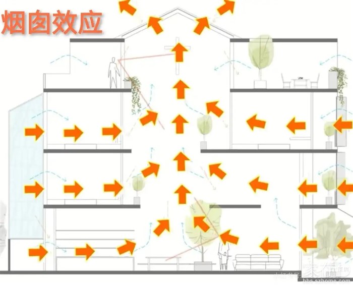 2. 拔风引气,吐故纳新:利用“烟囱效应”(第6张图原理示意图)——热空气从底部上升、从屋顶排出(红箭头),冷空气从侧面补充(蓝箭头),形成无声气流循环,替代机械通风,实现“清新常在”。这与第1张图四合院“藏风聚气”的气流逻辑一脉相承,却用现代科学(烟囱效应)精准落地。