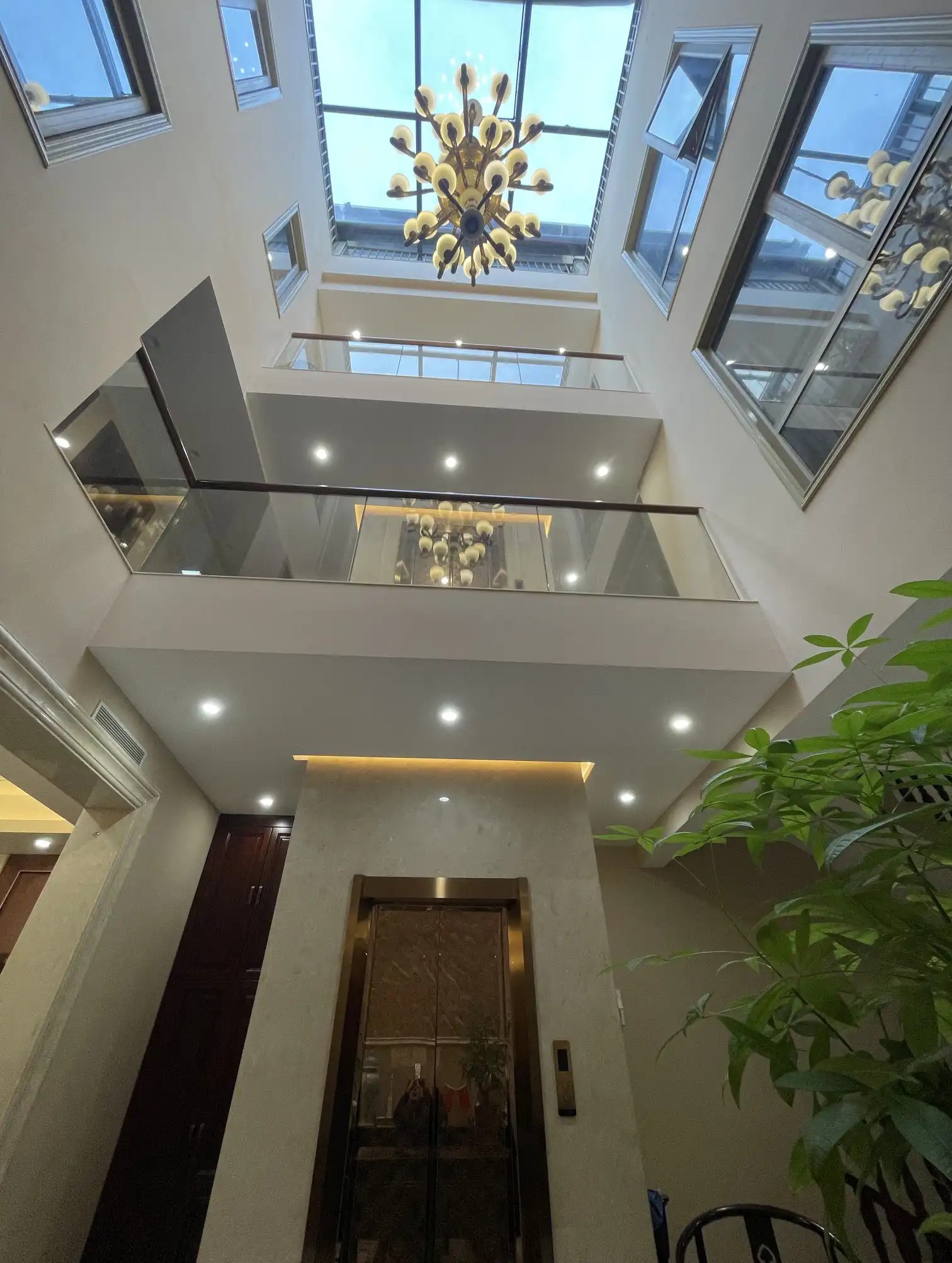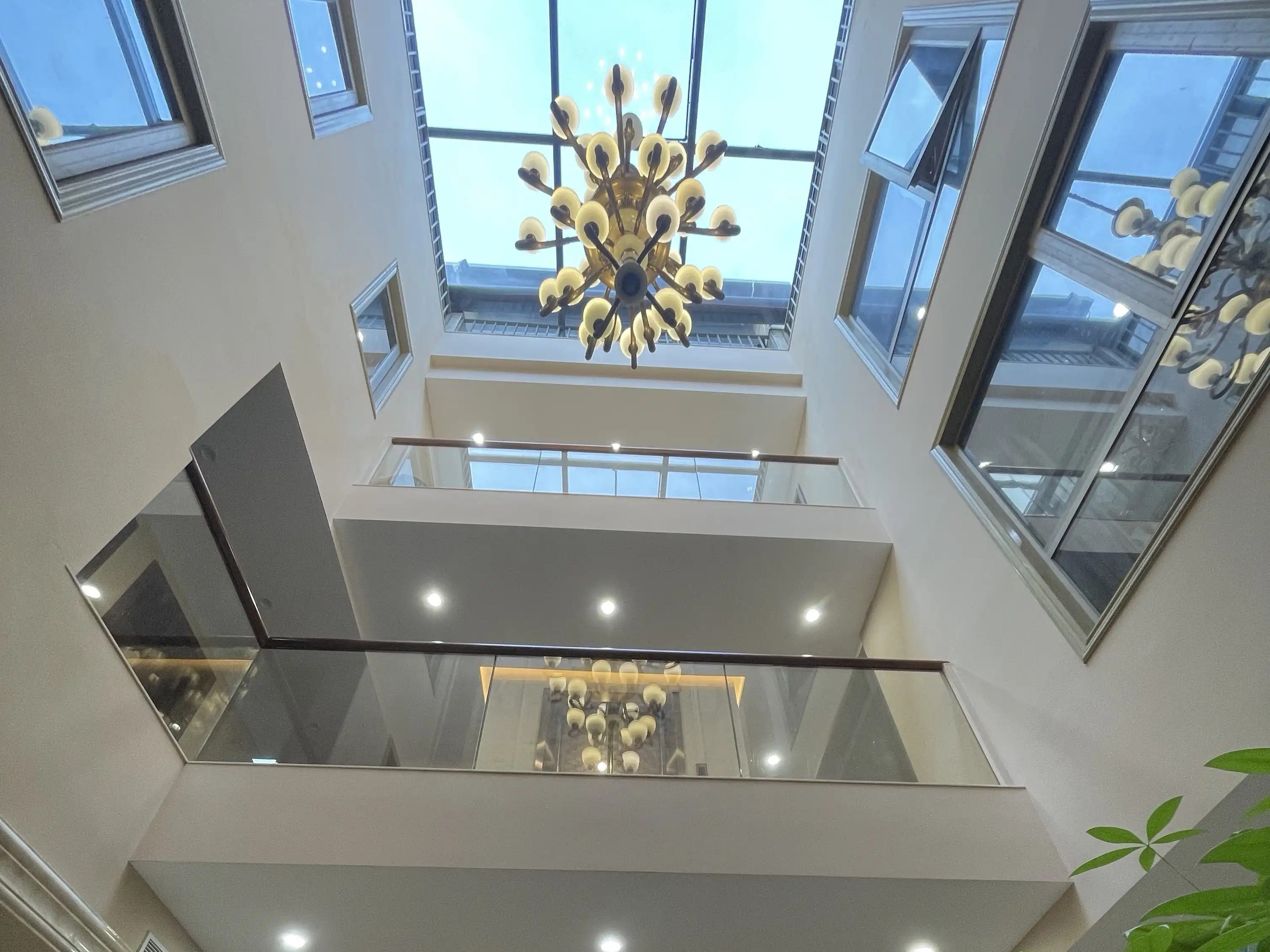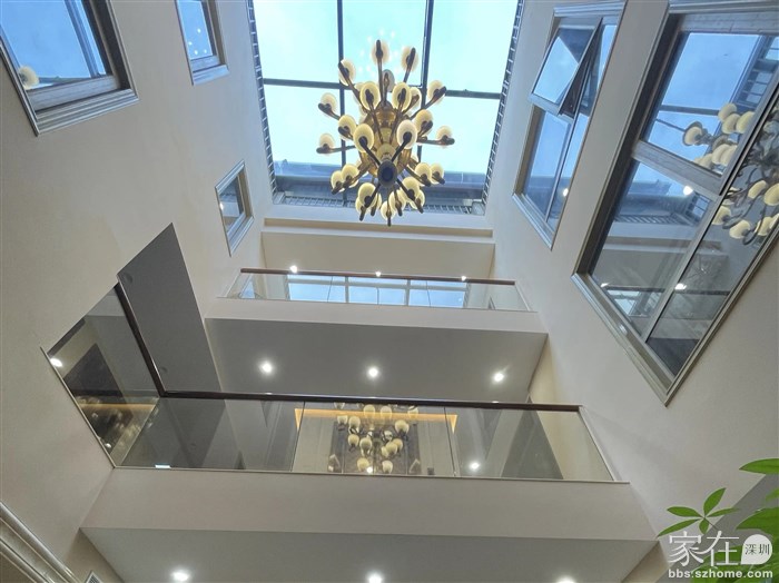 - 以“挑高至顶”的纵向空间(第2、3、4张图“挑高空间、仰拍/俯拍视角”)强化纵深感,搭配多层楼板与玻璃护栏(第2张“二层、三层玻璃护栏”,第4张“上下两层楼+棕色/浅色边框护栏”),形成“立体贯通”的层次。