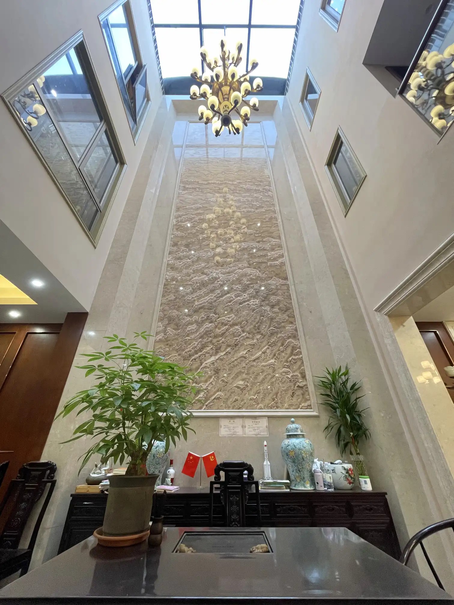 - 光:除玻璃天井与天窗引光外,第2、3、4张图的“多头吊灯、树枝状吊灯、球形吊灯”以暖黄光芒补充人工照明,与天光呼应,保持“灯光柔和”。