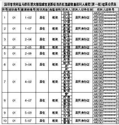 附件:1. 深圳市光明区马田街道大围拟城市更新项目历史违建物业权利人核实(第一批)结果公示表