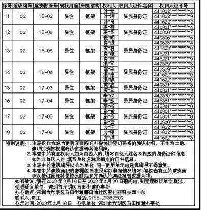 光明区马田街道大围拟城市更新项目(以下简称“本项目”)范围内涉及第一批信息核实结果公示的建筑物18栋。现就本项目拆除范围内相关建筑物的第一批权利人信息核实结果进行公示(详见附件1、2)。