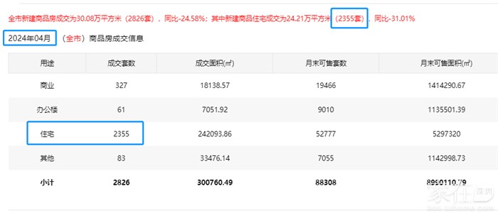 全市新建商品房成交为30.08万平方米(2826套),同比-24.58%;其中新建商品住宅成交为24.21万平方米(2355套),同比-31.01%