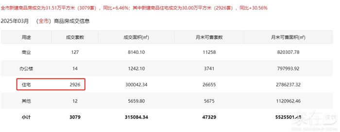 全市新建商品房成交为31.51万平方米(3079套),同比+6.46%;其中新建商品住宅成交为30.00万平方米(2926套),同比+30.56%