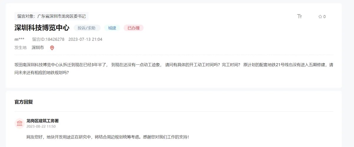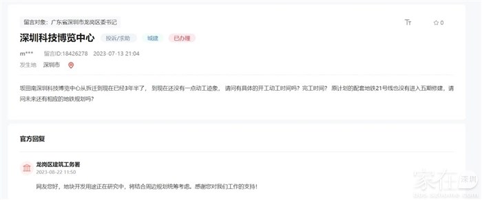 引用我是韭菜666的发言:因市民未留联系方式无法告知办理情况,具体办理情况如下:尊敬的市民您好,经核实,你提出的深圳科技博览中心问题还在前期策划阶段,关于科技博览中心相关情况工务署会有公示。其他问题请咨询教育局或街道办。。区建筑工务署2023-08-23