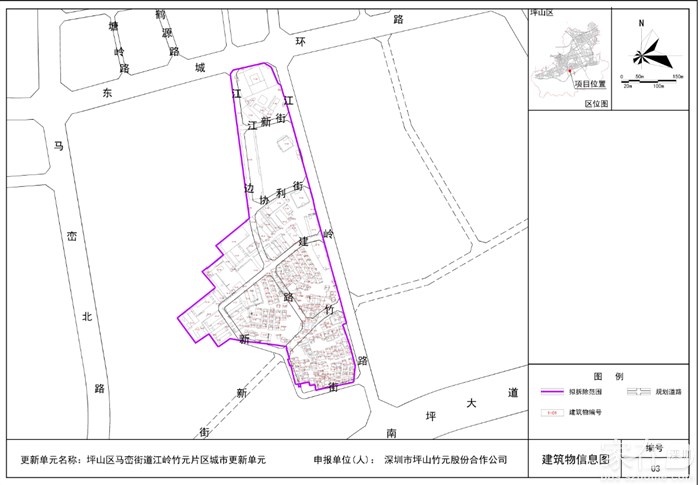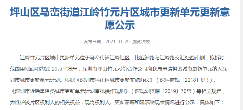江岭竹元片区城市更新单元位于马峦街道江岭社区,比亚迪路与江岭路交汇处西南侧,拟拆除范围用地面积约20.29万平方米,深圳市坪山竹元股份合作公司向我局申请将该城市更新单元纳入深圳市城市更新单元计划。根据《深圳市坪山区城市更新实施办法》(深坪府规〔2018〕8号)、《深圳市拆除重建类城市更新单元计划审批操作规则》(深规划资源〔2019〕70号)等相关规定,为维护该片区权利人的相关权益,现将权利人、更新意愿和建筑物现状情况进行公示