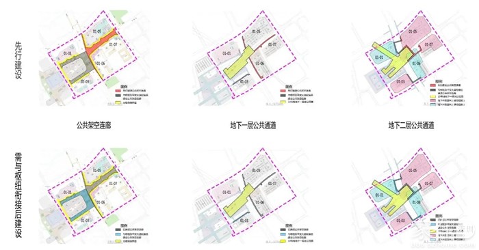 规划除对设计进行管控外,根据与地铁衔接的紧密程度、一体化建设的实施要求,通过分区管控手段,明晰可独立开发建设和需地铁衔接后建设的两类分区。针对道路、连廊、地下通道等公共系统,明晰其建设主体与建设形式。