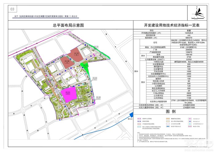 横岗街道六约社区埔厦片区城市更新单元于2020年4月9日列入《2020年龙岗区城市更新单元计划第一批计划》,现该更新单元规划(草案)已经龙岗区城市更新领导小组2023年第5次工作会议审议并获原则通过。根据《中华人民共和国城乡规划法》《深圳市城市更新办法实施细则》以及《深圳市拆除重建类城市更新单元规划审批规定》(深规划资源规﹝2020﹞2号)等规定,现予以公开展示,内容如下: 一、项目区位 项目位于深圳市龙岗区中部横岗街道六约社区,南侧临近城市主干道龙岗大道,东侧紧临平盐铁路,北侧紧临城市主干道红棉路。 二、已批计划调整情况 本次更新单元规划因技术误差及转换2000国家大地坐标系调整已批计划拆除范围,拆除范围用地面积由222678平方米调整为221870.7平方米。根据《深圳市拆除重建类城市更新单元规划审批规定》(深规划资源规﹝2020﹞2号)第十二条,该更新单元计划调整内容可与更新单元规划同步公示、同步申报审批。 三、主要技术经济指标 项目更新单元用地面积243751.1平方米,拆除范围用地面积221870.7平方米,开发建设用地面积143545平方米(含划入零星用地478.7平方米),规划容积685370平方米,其中住宅286290平方米(含租赁型人才住房15284平方米、公共租赁住房15283平方米、安居型商品房15283平方米),商业、办公及旅馆业建筑3160平方米(含母婴室10平方米),厂房264000平方米,产业配套用房109870平方米(含宿舍106140平方米,商业服务设施3730平方米),公共配套设施(含地下)22050平方米(含15班幼儿园4500平方米、占地面积4500平方米,社区管理用房300平方米,便民服务站600平方米,社区警务室100平方米,文化活动室1000平方米,社区健康服务中心2000平方米,社区老年人日间照料中心1500平方米,邮政所100平方米,小型垃圾转运站500平方米,公共厕所120平方米,再生资源回收站300平方米,环卫工人作息房20平方米,110KV变电站2800平方米,公交首末站4300平方米,公共充电站1100平方米,综合接入机房60平方米,社区级公共配套用房2750平方米<含社区党群服务中心650平方米,托育服务机构600平方米>)。另配建社区体育活动场地2处占地3000平方米,社区儿童游戏场地3处占地1500平方米。物业服务用房按照《深圳经济特区物业管理条例》予以核定。 四、公示地点 (一)现场展示 1.深圳市龙岗区城市更新和土地整备局 地址:深圳市龙岗区龙城街道龙飞大道983号黄阁坑股份大厦 2.深圳市龙岗区横岗街道办事处 地址:深圳市龙岗区龙岗大道(横岗段)4001号 3.项目现场 地址:广东省深圳市龙岗区埔厦路46号 (二)平面媒体展示 深圳商报 (三)网上展示 龙岗政府在线(龙岗区城市更新和土地整备局)网站 网址: 五、公示时间 为期30个自然日,自2023年6月13日至2023年7月12日止。 六、意见反馈 1.公示期间,对该规划草案有任何意见或建议需书面反馈,请直接投至龙岗区行政服务大厅龙岗区城市更新和土地整备局窗口(地址:龙岗区龙岗中心城龙翔大道8033-1号),截止日期为2023年7月12日(如邮寄,以邮戳日期为准); 2.个人反馈的,需附个人地址、身份证复印件、联系方式; 3.多人共同反馈的,需附每个反馈人的身份证复印件、地址和委托代理人的身份证复印件、地址、联系方式; 4.单位反馈的,需附单位法人、委托代理人的身份证复印件、地址、联系方式。 七、联系方式 深圳市龙岗区城市更新和土地整备局 地址:深圳市龙岗区龙城街道龙飞大道983号黄阁坑股份大厦 联系人:王工,电话:0755-89620041,传真:0755-28948122 八、版本声明 本次公示的更新单元规划仅为草案,最终成果以政府批件为准。热忱欢迎广大市民和社会各界人士踊跃参与,并提出意见或建议。 特此公示。 深圳市龙岗区城市更新和土地整备局 2023年6月13日