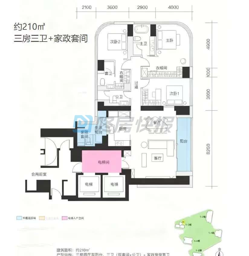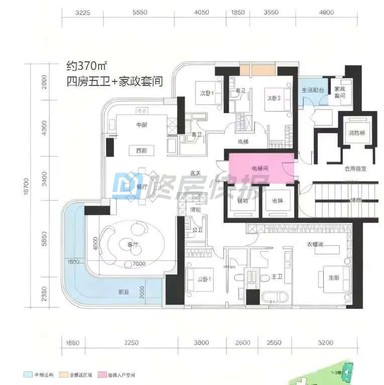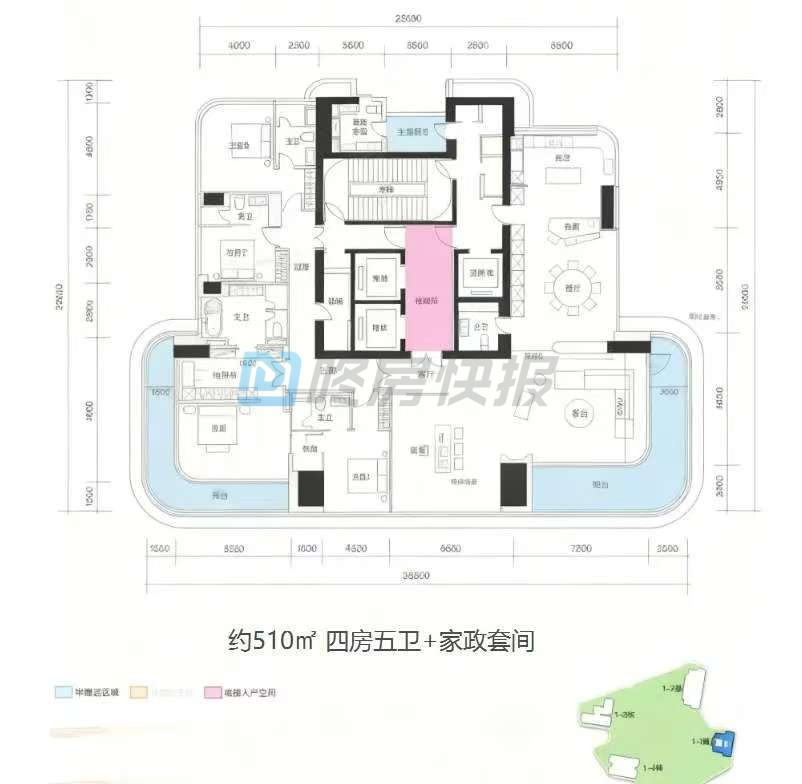 4、一期 5 栋全做大平层,一层 1-3 户,3-5 梯 2 户配置,顶豪 490㎡一层一户,私密性和电梯比优于深圳湾 1 号同面积产品。