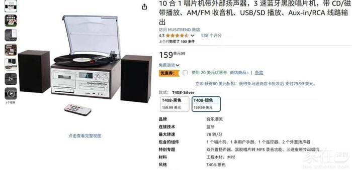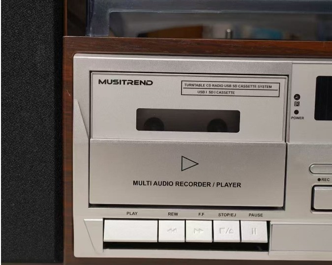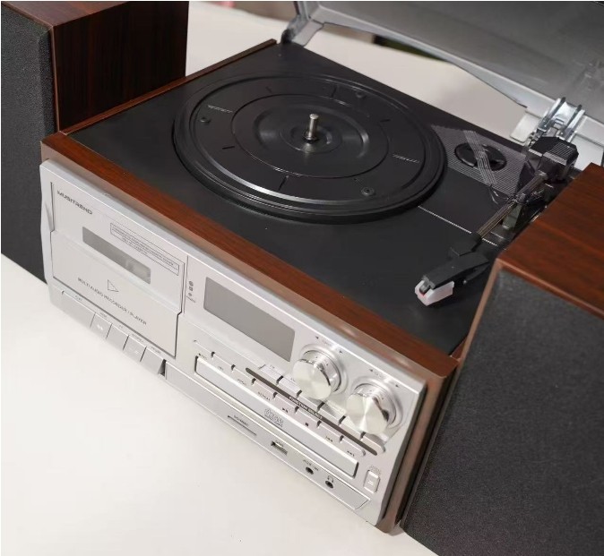 这款几乎全功能机子,款式大气好看全新箱中箱稀少量27套到货,买回去不管是当蓝牙音箱,还是听CD机,磁带机或者黑胶机都满足需求了,MUSITREND出159.99美元的组合机,折合1150元左右, 10合1多功能木质组合音响,带屏幕有时间显示, 黑胶唱片机+CD机+磁带机+FM/AM收音机+蓝牙音箱+SD/MMC/U盘播放, 支持AUX-IN, RCA线路输出,带有遥控器,支持插耳机。(2*10W)20W功率立体声木质副箱,音质还是不错的。【CD/磁带/黑胶唱片到 MP3 录音】将黑胶唱片、Aux-in、CD、卡带转换为 USB/SD(MP3 格式),并将 USB/SD、CD、黑胶唱片、Aux-in 直接录制到卡带中。三速皮带传动唱机:钻石头唱针可播放7英寸、10英寸和12英寸黑胶唱片,速度分别为33 1/3、45和78 RPM。自动停止设置可在唱片末尾自动停止。FM收音机:87.50-108.00MHz频段,0.05的步进,AM收音机频段:520-1710KHz,搜台效果还不错,我们有实拍收音机实测效果视频。可以自动存台,可以存20个电台。电压是100-230V通用电压,插头是一大一小扁插头,我们会配送一个转换头方便直接插插座。CD机按键自动进出仓。副箱尺寸:高度宽度15cm. 深度:主机尺寸:长宽度28cm. 高度20cm。 带包装整套重量:6.2kg。