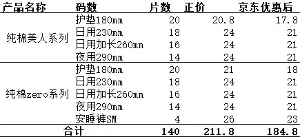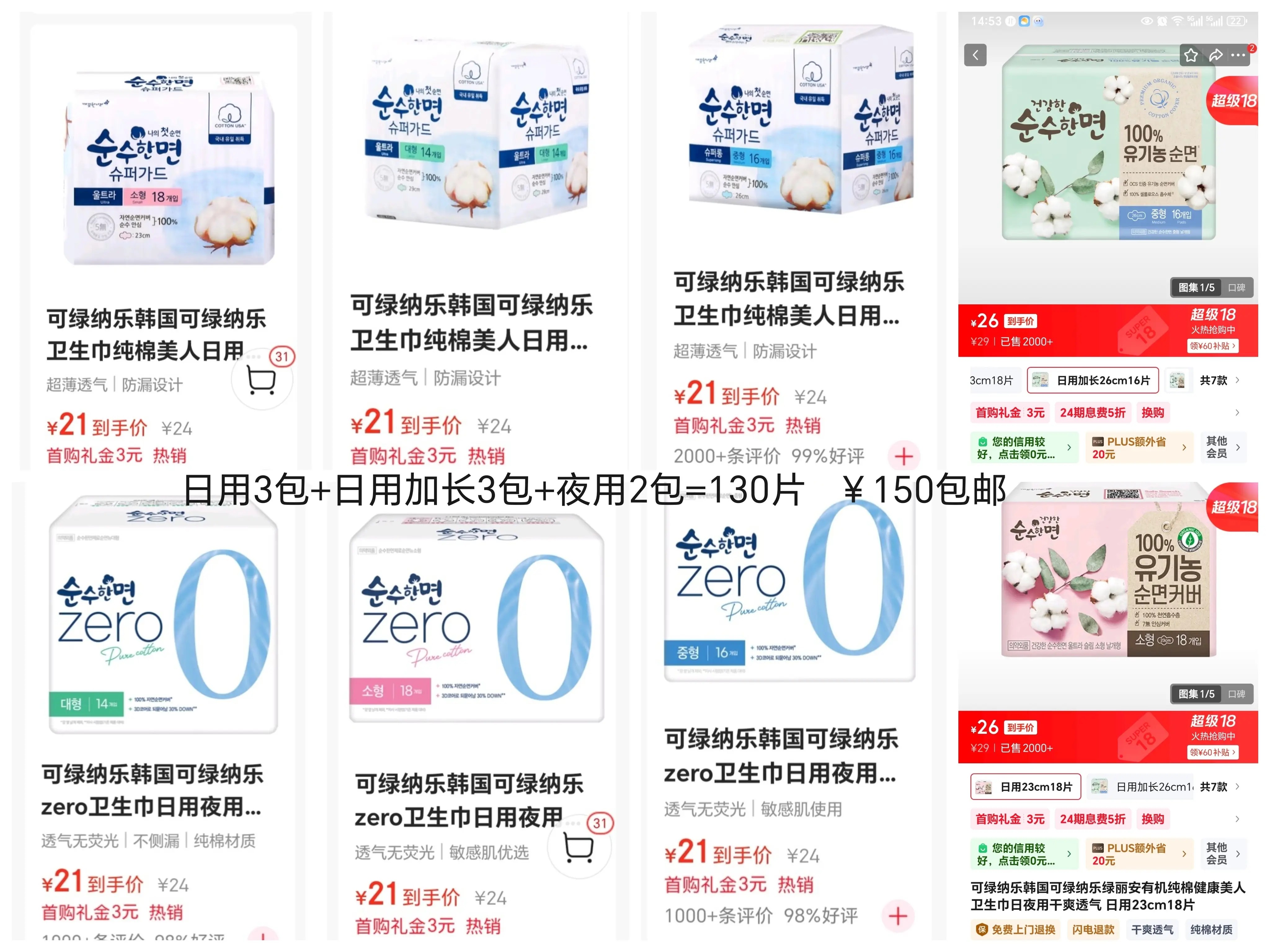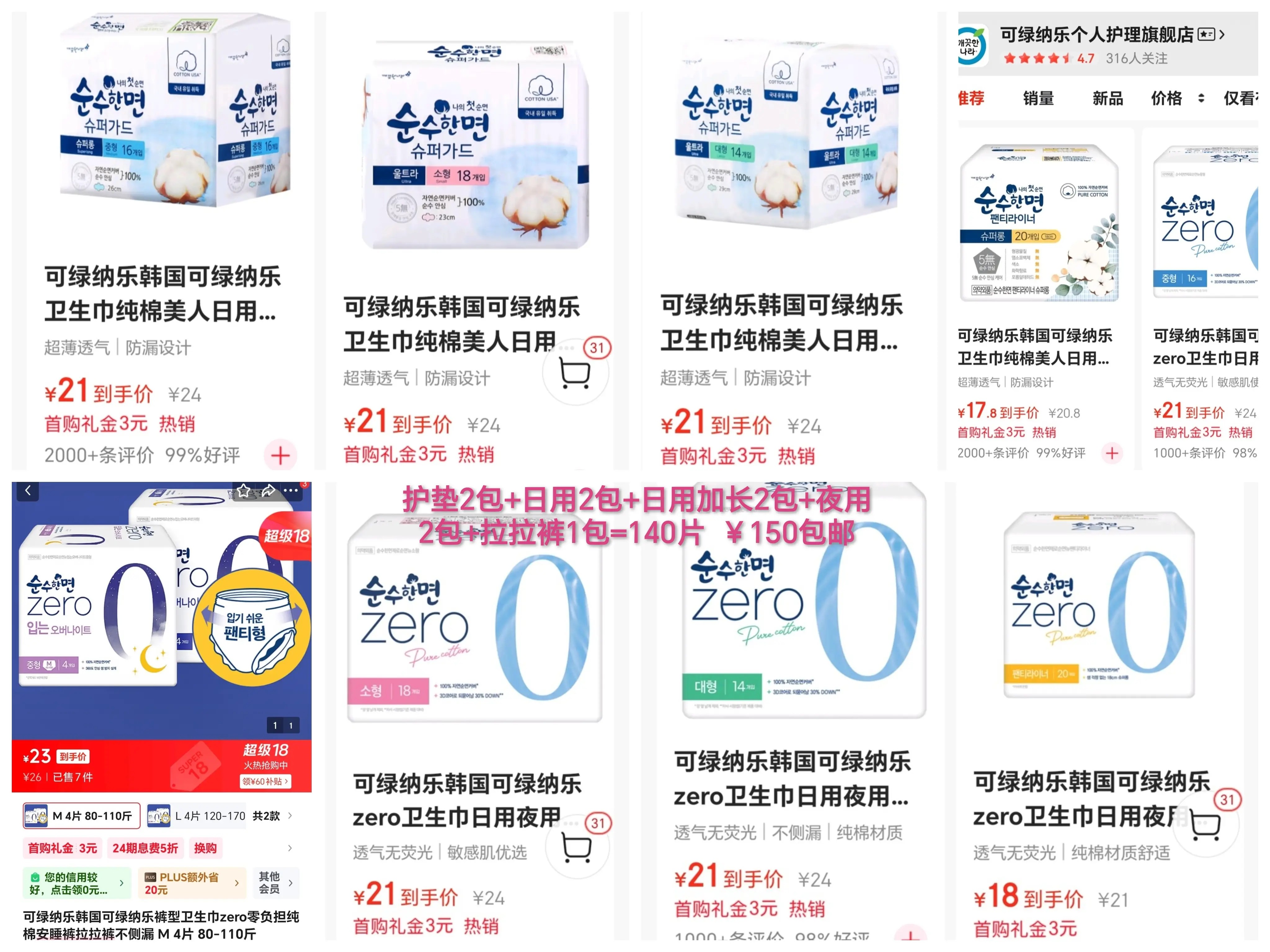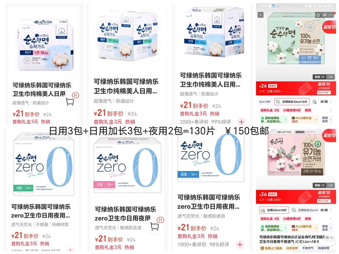可绿纳乐韩国卫生巾套装,京东比价,每套150元((包邮)),相当于打8折