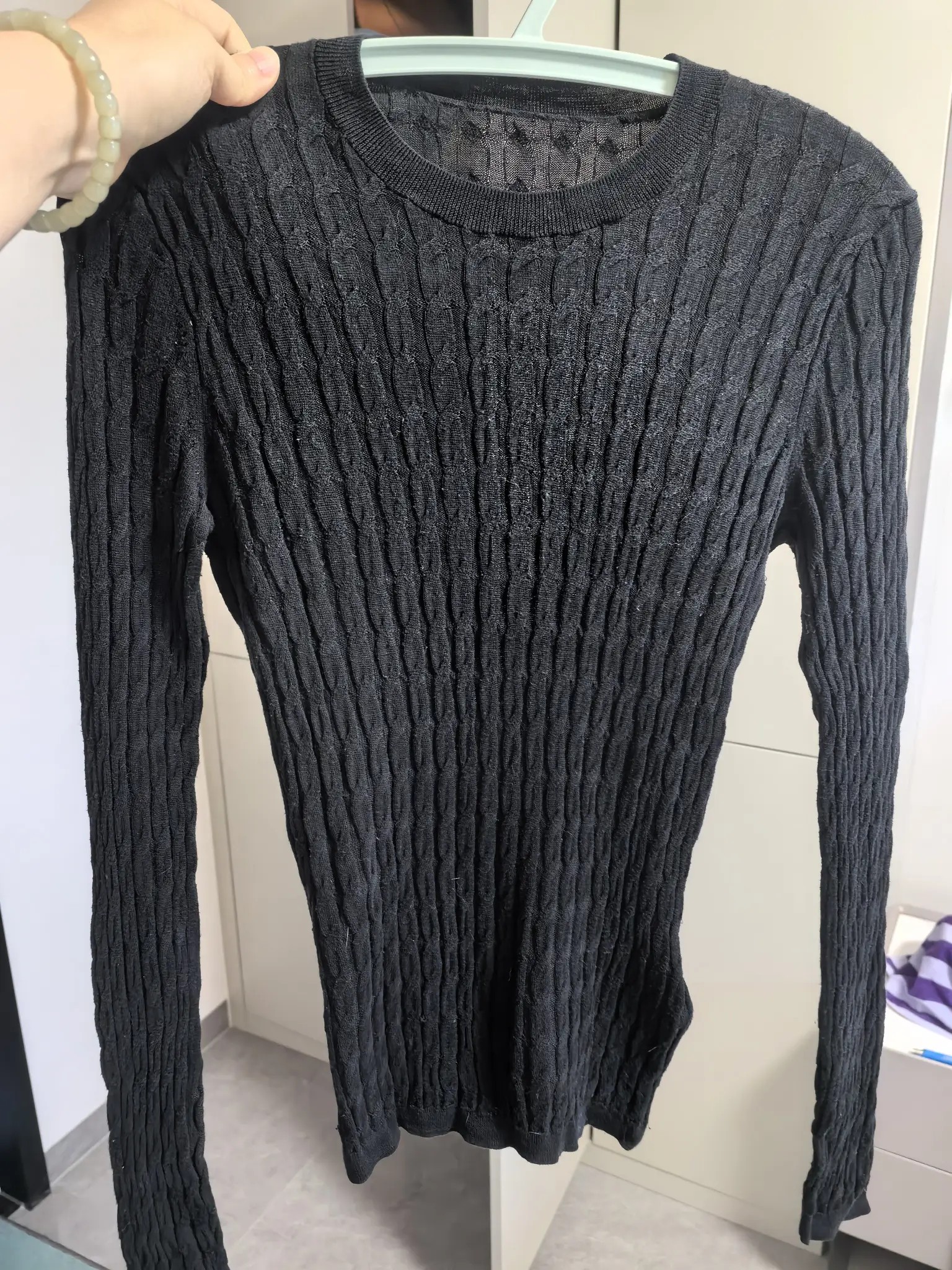 引用楼主的发言:百分百桑蚕丝,打底,很舒服,不变形,穿着也不会松,适合L,洗了以后还是有弹性,与图一致。9新,我穿着有点紧,都是亏本处理,40转