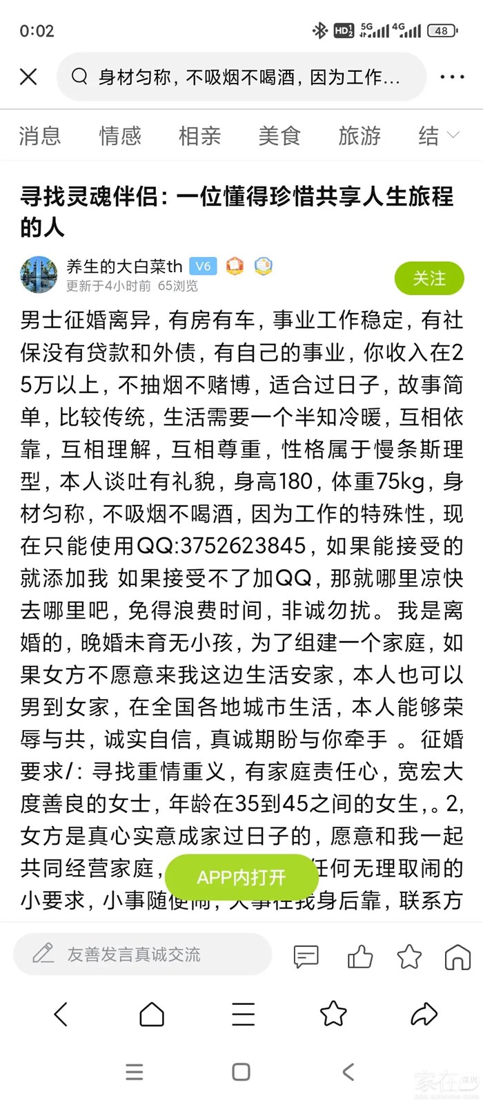 男士征婚离异,有房有车,事业工作稳定,有社保没有贷款和外债,有自己的事业,你收入在25万以上,不抽烟不赌博,适合过日子,故事简单,比较传统,生活需要一个半知冷暖,互相依靠,互相理解,互相尊重,性格属于慢条斯理型,本人谈吐有礼貌,身高180,体重75kg,身材匀称,不吸烟不喝酒,因为工作的特殊性,现在只能使用QQ:3752623845,如果能接受的就添加我 如果接受不了加QQ,那就哪里凉快去哪里吧,免得浪费时间,非诚勿扰。 我是离婚的,晚婚未育无小孩,为了组建一个家庭,如果女方不愿意来我这边生活安家,本人也可以男到女家,在全国各地城市生活,本人能够荣辱与共,诚实自信,真诚期盼与你牵手 。 征婚要求/:寻找重情重义,有家庭责任心,宽宏大度善良的女士,年龄在35到45之间的女生,。2,女方是真心实意成家过日子的,愿意和我一起共同经营家庭,可以满足你的任何无理取闹的小要求,小事随便闹,大事往我身后靠,联系方式 3752623845 。本信息的所有权属陈先生,谢绝转载本人信息,谢绝抄袭信息内容,谢绝改写摘编信息内容,我比较老实勤快,不会那么多甜言蜜语,希望未来的他相互信任,一起完成人生大事 ,私信不回,可以直接添加我的联系方式。